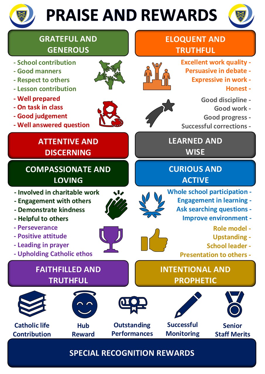 All praise is awarded through Arbor and has a direct connection to our School Values. We reward our students for demonstrating the key values we wish them to carry through into society and live as one of God's children
